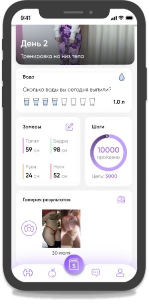 Теперь в твоём телефоне будет личный фитнес-дневник, в котором ты сможешь отслеживать: выпитую воду за день, шаги, как меняется твой вес и замеры тела, а ещё круче - сможешь хранить свои фото до/после в галереи результатов.